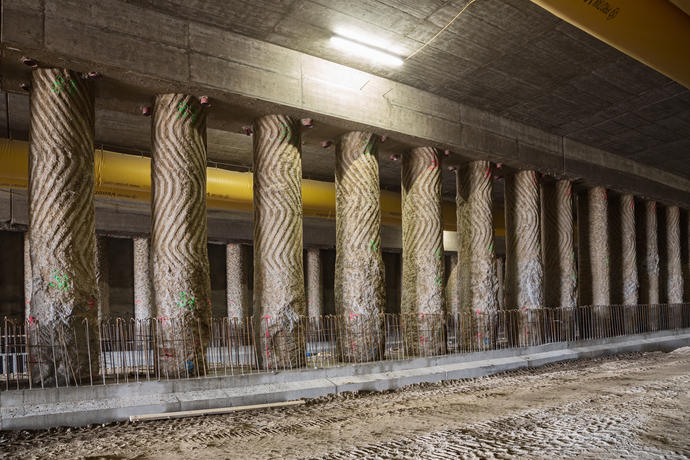 Les parois de pieux sécants sont constituées de pieux forés disposés de sorte qu’il reste un espace entre les pieux. Le sol entre les pieux est sécurisé pendant les travaux d’excavation, soit par une coque de béton projeté, soit par la mise en place de colonnes d’étanchéité de remplissage en Soilcrete®.